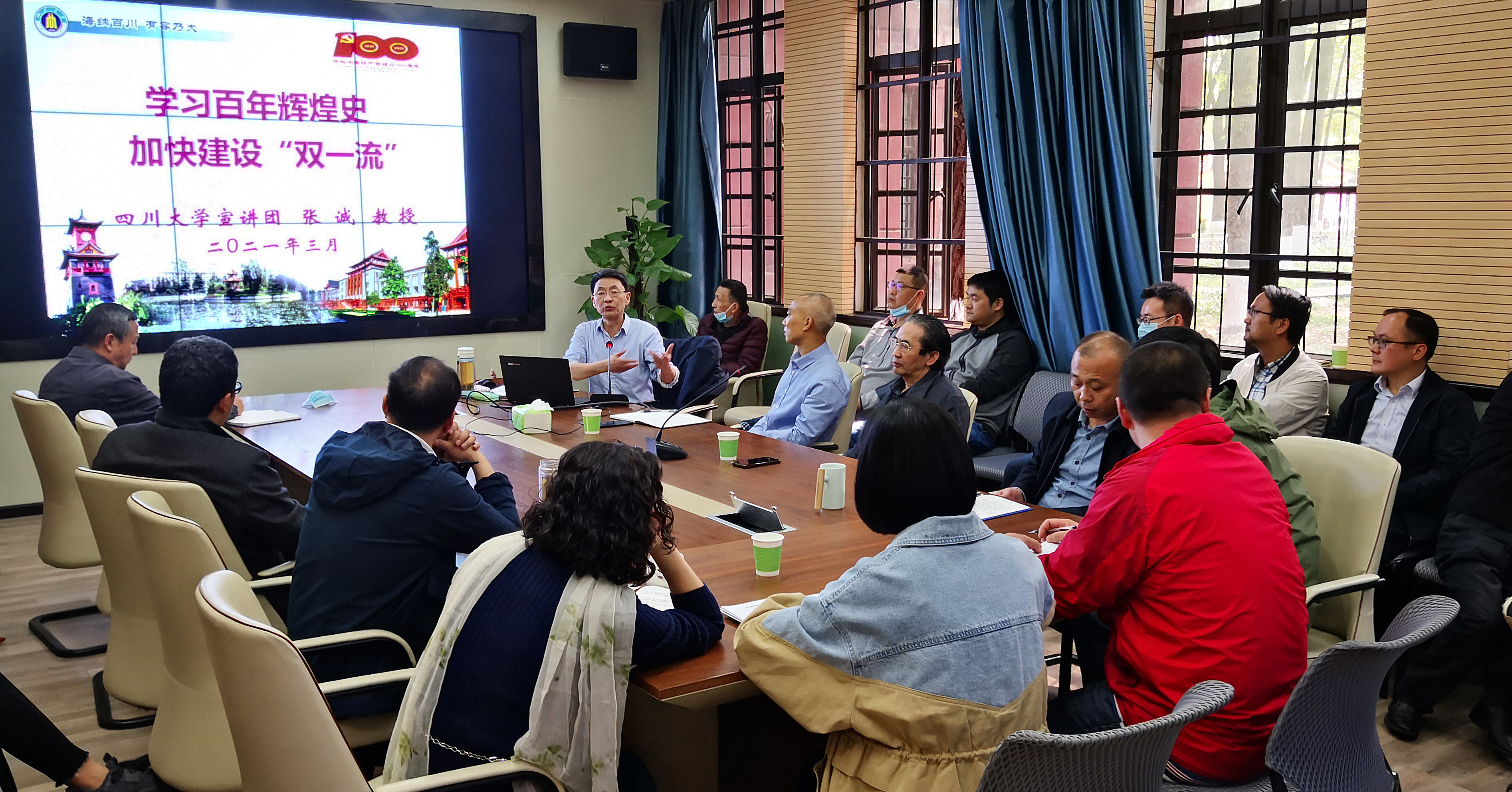 紧接着,他以习总书记在党史学习教育动员大会上的重要讲话精神为遵循,从六个方面交流了学习百年党史对我们奋进新时代的若干启示。他还紧密联系学校实际,宣讲了在党的领导下,四川大学党组织引领师生职工在我国革命、建设、改革和奋进新时代的历史进程中做出的突出贡献。他强调,我们一定要按照党中央部署以及学校党委的安排,做到“学史明理、学史增信、学史崇德、学史力行”,把学习感悟转化为全面加快推进校院和本单位争创一流的实际行动。张诚激情生动的宣讲,赢得了与会同志们的热烈掌声。
