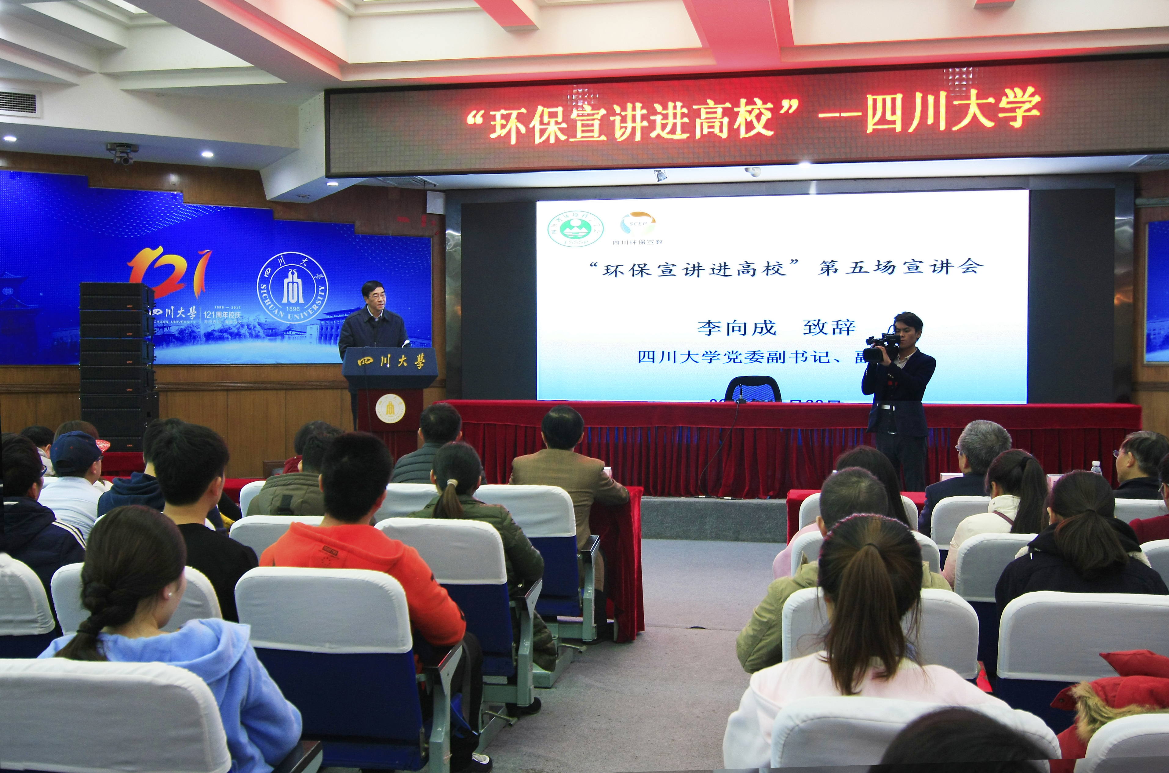 校党委副书记、副校长李向成致欢迎辞,希望广大青年学生积极学习和践行十九大精神,牢固树立绿色发展理念,全面正确地认识环境保护在社会经济发展中的作用和影响,提高环境与健康素养,在环保大传播中发挥其先锋作用,积极践行生态文明建设和绿色发展。同时也希望学校从事环境研究和环保治理工作的专家们积极与四川省环保厅和环境学会相对接,进一步加强科学研究的针对性,把研究的新成果、新技术运用到实际工作中,切实为国家实现生态环境根本好转和生态文明建设作出贡献。