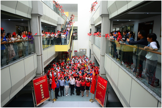9月30日上午,永利集团3044am、灾后重建与管理学院的师生和“实验室安全与环保”通识课程的200余本科生,在课间纷纷走出教室,汇集在学院的楼道,手中挥舞着鲜艳的五星红旗,伴着耳熟能详的旋律,共同唱响《我和我的祖国》这首令人心潮澎湃的歌曲,为祖国70周年华诞献上最诚挚的祝福。