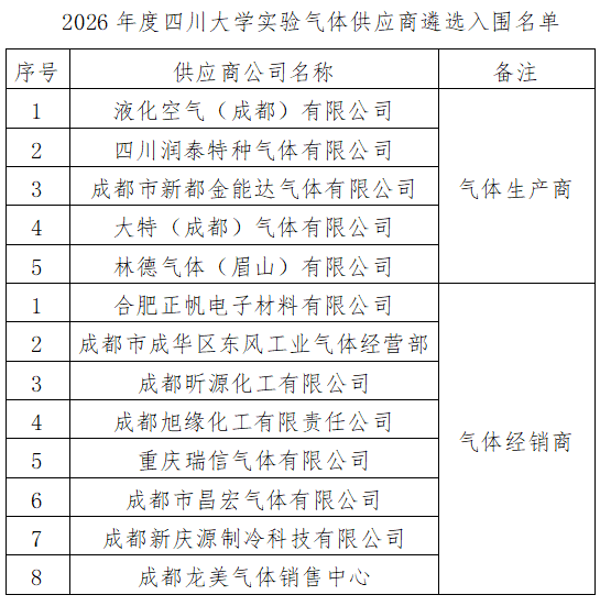 附件:2026年度四川大学实验气体供应商遴选入围名单